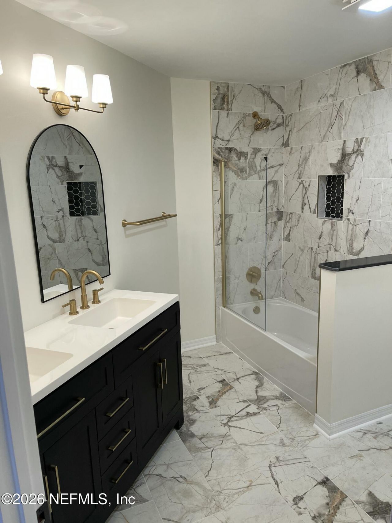Step into 1159 Romaine Circle East, an extensively renovated corner patio home in Jacksonville's desirable Brookwood Forest. Situated on a large corner lot just minutes from I-295 and Mayport Naval Station, this turnkey residence features 2 bedroom, 2 baths, a one-car garage plus driveway parking, an array of designer upgrades throughout. A gated private courtyard welcomes you, an ideal oasis for quiet relaxation inside, new flooring and fresh paint flow throughout. The first-floor full bath has been completely reimagined with custom tilework and modern finishes. The updated kitchen is a cook's dream, offering granite countertops, abundant cabinetry, custom shelving perfect for a coffee bar, and a full suite of brand-new stainless-steel appliances (refrigerator, dishwasher, microwave, stove and garbage disposal). A convenient laundry room with washer and dryer sits just off the kitchen. An open dining and living area is highlighted by soaring ceilings, plentiful natural light, dramatic chandelier, and striking tile fireplace. Upstairs, the landing affords a view down through a wall of windows to the living area and the rear yard, which is enclosed by a new fence. The second bedroom or home office includes a built-in closet. The spacious primary suite is a true retreat with vaulted ceilings, sliding doors to a private deck, and a custom closet. The en-suite bath features a tub/shower with a frameless glass panel, a large double vanity and tasteful tile details. Ample walk-in attic storage completes the package. With thoughtful design and high-quality finishes throughout, this Brookwood Forest patio home offers stylish, comfortable living. Schedule a showing today.