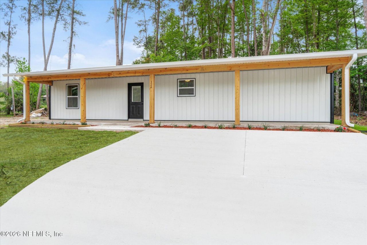 This 3-bedroom, 2-bathroom new construction barndominium sits on a high bluff. Built for durability and low maintenance, the home features metal siding and a metal roof. Key Interior FeaturesKitchen: White shaker soft-close cabinets, quartz countertops, and stainless steel appliances.Master Suite: Vaulted ceilings, large walk-in closet, double vanity, and a tiled walk-in shower.Systems: Spray foam insulation in the attic and a propane tankless water heater.Laundry: Washer and dryer are included.Outdoor & Custom DetailsFront Porch: A large covered porch spans the entire front of the house. It features rough-cut pine accents harvested directly from the property.Rear Patio: Large patio area accessed via French doors, suitable for a grill.It is located directly across the street from a canal leading to the St. Johns River, with several public boat ramps nearby.