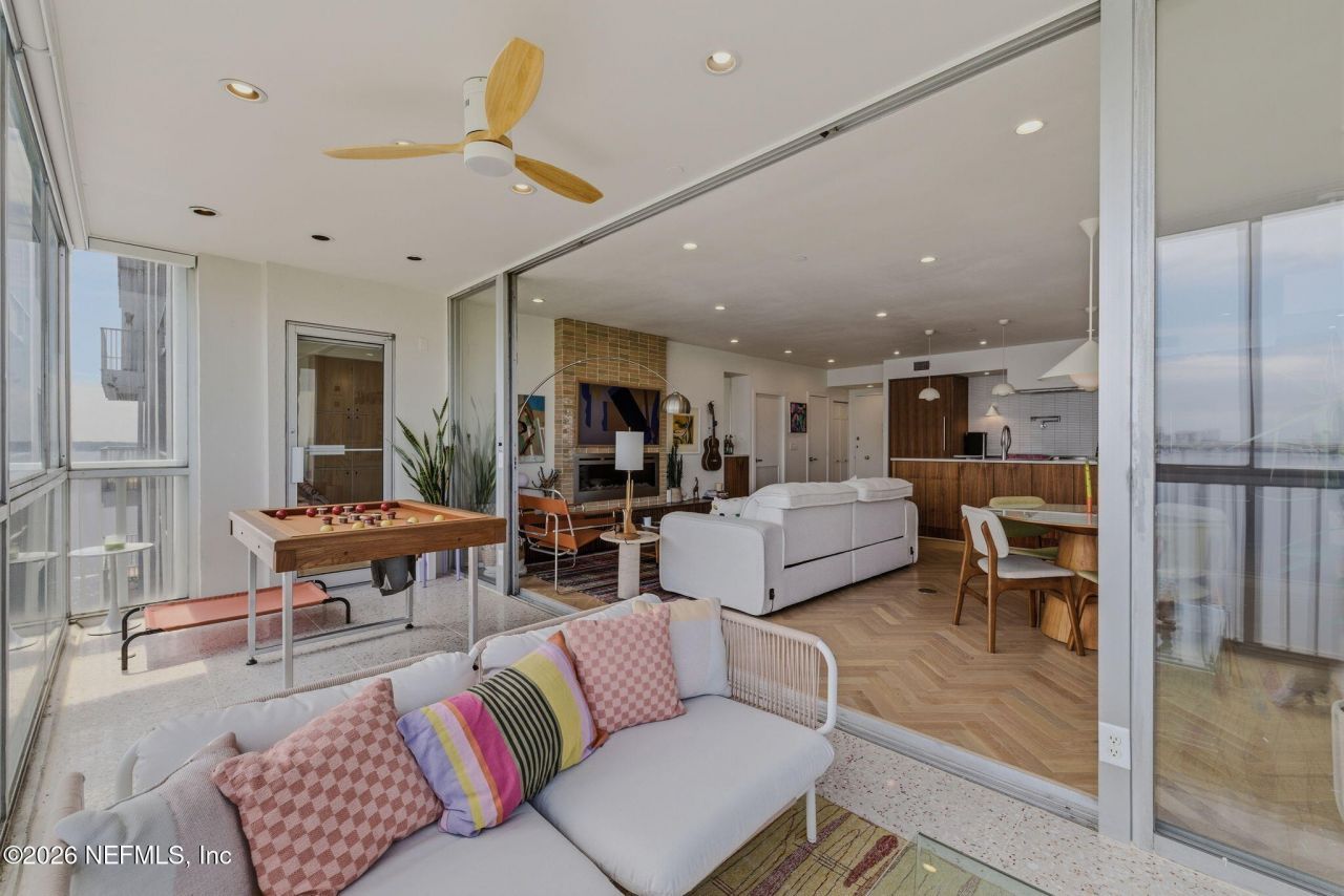 Beautifully updated 2BR/1.5BA condo with downtown skyline and river views at 1560 Lancaster Ter, Unit 1006. Features approx. 1,115 total SF (935 heated + 180 SF enclosed balcony with operable windows), offering flexible living space. Open floor plan with custom flat-panel walnut kitchen, paneled dishwasher and Sub-Zero fridge, white oak herringbone floors throughout, and custom white oak cabinetry in baths and bedroom. Terrazzo flooring in balcony and main bath, plus custom handmade Zellige tile electric fireplace. New HVAC (2024). Includes 1 garage parking space and additional front parking. Concierge building with pool and gym. HOA $918.59/month includes water. Electric averages $30-$55/month. Option to purchase fully furnished.