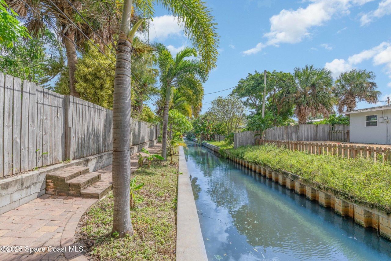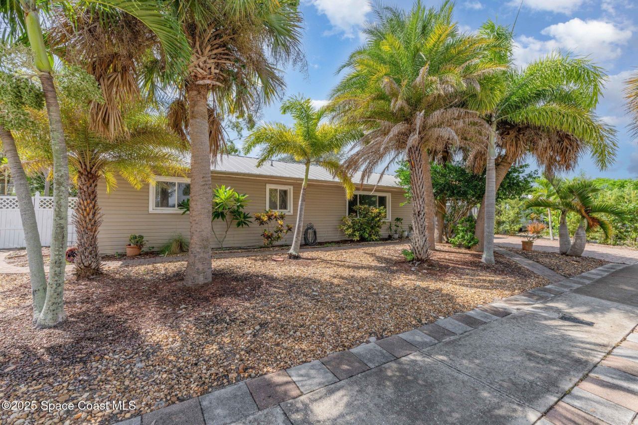 Welcome to your beachside family home! Step inside to an updated kitchen, perfect for family meals and entertaining. The home features a metal roof and hurricane-rated windows, providing peace of mind year-round. Enjoy Floridas sunshine from the screened-in back porch or host gatherings on the expansive additional patio. Outdoors, youll find a spacious shed with electricity, ideal for hobbies or extra storage. The lush yard is shaded with mature trees, (See below) while the paver driveway and side parking pad offer room for even a small boat. In the back, a serene waterway invites you to paddle board, fish, or simply take in the natural beauty of your surroundings. Just minutes from the beach, this home has the laid-back charm of coastal living. Various trees include, a verity of palms, maringa, fig, birds of paradise, mulberry, banana, coconut, strawberry, spinach, gardenia, multiple colored plumerias.