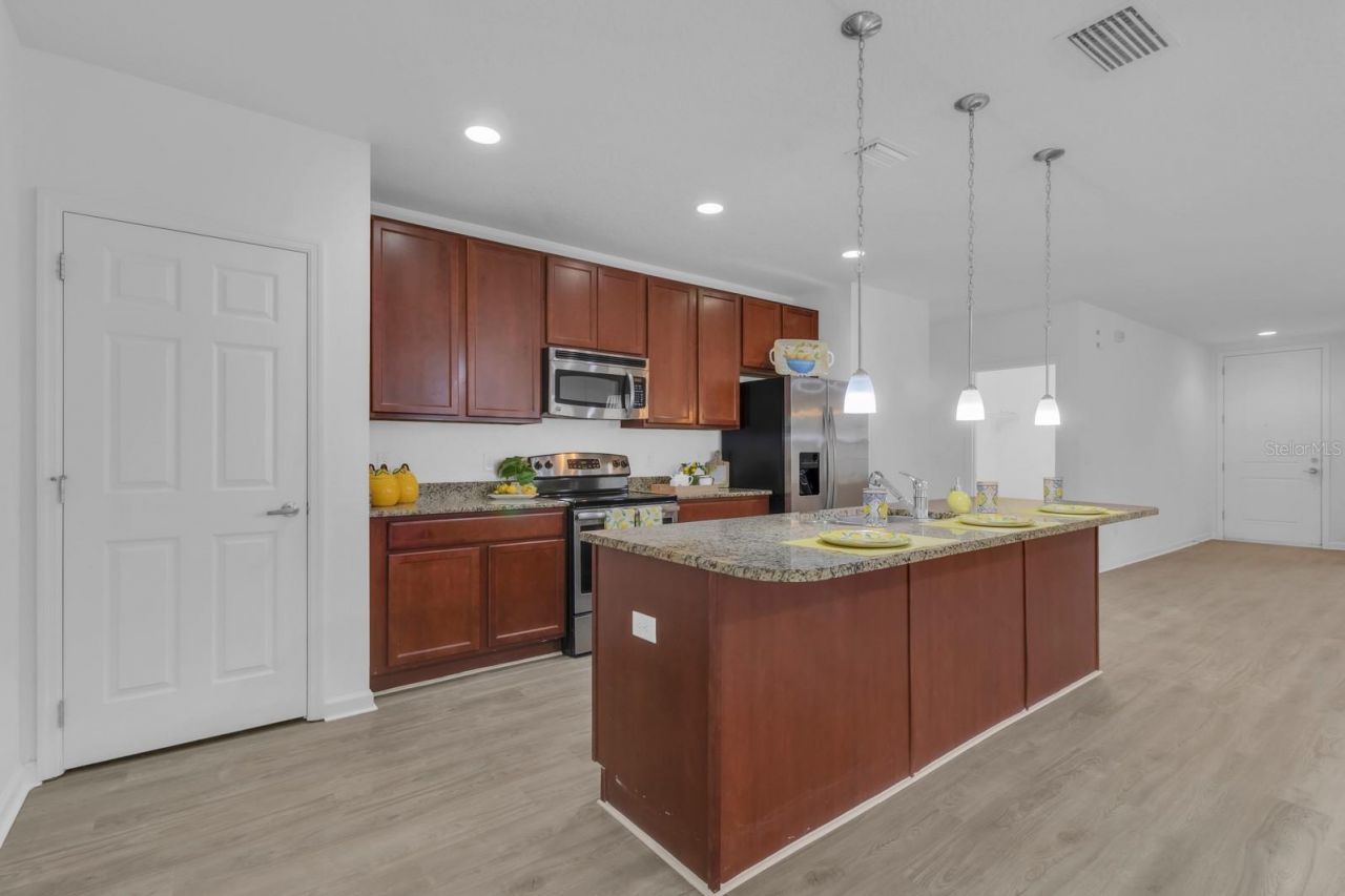 This stunning four-bedroom, two-bath, single story home is a true gem. The HVAC is 3 years old, inside, you'll find a spacious open floor plan, brand-new luxury vinyl plank flooring, and 8.5-foot ceilings that create a bright, airy feel. The kitchen is a chef's delight with 42 inch upper cabinets, a closet pantry, and granite countertops throughout the home. The primary suite is thoughtfully designed for privacy and comfort, featuring a large walk-in shower, double vanities, a private water closet, and two generous walk-in closets. Completing the home is a beautiful and durable terracotta clay tile roof, adding both charm and longevity. This home truly combines luxury, convenience, and resort style living at its finest! Nestled inside a beautifully HOA maintained gated community, this neighborhood offers an unparalleled blend of comfort, recreation, and natural beauty. Residents enjoy a grand clubhouse complete with an elegant event center perfect for weddings, family celebrations, and large gatherings along with multiple private meeting rooms for work or social activities.Step outside and experience amenities designed for every lifestyle: tennis courts, basketball courts, a kiddie playground, and charming picnic areas with BBQ stations set on a spacious lakeside deck overlooking serene Lake Toho. Stroll along the community's meandering streets and relax on shaded park benches as you take in the peaceful scenery and local birdlife. Conveniently located, this home puts you just 30 minutes from Magic Kingdom and SeaWorld, only minutes from Orlando International Airport, and close to countless navigable lakes for boating and outdoor fun.
