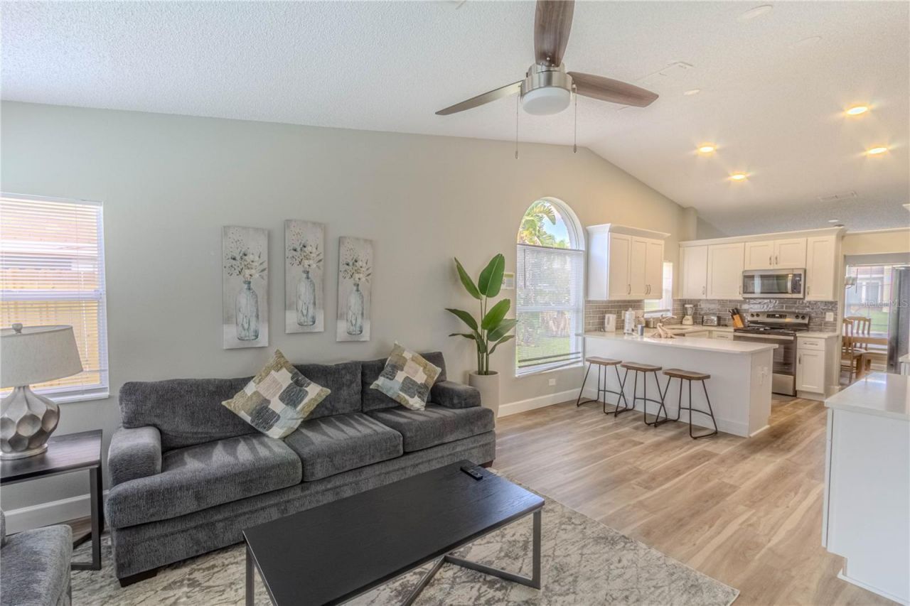 Experience the best of Florida living in this stunning three-bedroom, two-bath home, nestled in the sought-after Lindfields community. The meticulous pride of ownership is evident from the moment you step onto the manicured lawn. Inside, a bright and open floor plan is bathed in natural light, thanks to vaulted ceilings and multiple skylights. Gather with friends and family in the expansive living and dining areas or the gourmet eat-in kitchen, which features modern quartz counters, stainless steel appliances, and a breakfast bar. From the comfortable family room, step out to your private, screened-in lanai and take a dip in the free-form pool. The tranquil primary bedroom suite includes a walk-in closet and an elegant en-suite bathroom with a garden tub and separate shower. Two additional bedrooms are tucked away in a split-floor plan for privacy. Offered mostly furnished and with no HOA, this home is a turnkey opportunity for a primary residence, second home, or profitable vacation rental. Its unbeatable location is just minutes from world-class theme parks, dining, and shopping.