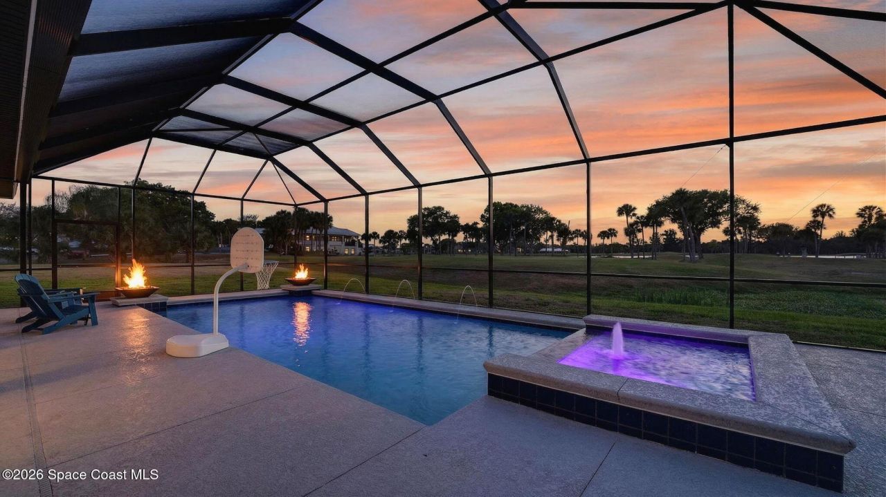 **Merritt Island Grandeur Awaits: Your Stunning 4-Bedroom (with Bonus/Den/Office) Salt-Water Pool Home Oasis is Here; Unrivaled Lake and Golf Course/ Sunset Views** Step into your meticulously and prestigiously renovated sanctuary, a remarkable 4-bedroom, 2-bathroom home, that epitomizes luxury and comfort. Nestled in the serene Savannahs neighborhood, this indoor/outdoor paradise features a custom saltwater pool, accompanied by a heated Therapy Spa, all enhanced with remote-controlled Lighting and enchanting Fountain features. Breathtaking sunsets await you from the spacious screened-in area, complemented by a well-equipped outdoor kitchen perfect for entertaining or peaceful relaxation.Inside, youre greeted by a Move-In-Ready, open floor plan, filled with natural light and a state-of-the-art kitchen, which boasts of granite countertops, a massive island perfect for cooking and company, high-end appliances, including a 48-inch Cafe refrigerator. Expansive Main Bedroom Retreat: The spacious main bedroom features an enhanced en-suite bathroom that exemplifies a substantial investment in luxury finishes. The designer closets are thoughtfully crafted with built-in features, providing both style and functionality. An adjoining customized bath, spa-like retreat offers finishing touches that are truly luxurious. **Additional Features Throughout:**Safety First: New hurricane-rated garage door and opener ensure peace of mind.Peace of Mind: A brand-new roof in 2023 protects your investment.Modern Aesthetic: Freshly painted interiors and exteriors create a contemporary, inviting atmosphere.Luxury Bathrooms: Both bathrooms are fully renovated, showcasing over $70K in exquisite contemporary finishes.Elegant Touches: Crown molding adds sophistication to the living room and master suite new upscale baseboards throughoutStylish Storage: The designer walk-in closet features a chic barn door for added flair.Meticulous Craftsmanship: All new door handles and fixtures reflect careful attention to detail.Comfort Underfoot: Luxurious top-grade carpeting in all bedrooms.Durable Design: Ceramic tile flooring graces the living room, dining room, breakfast nook, and den.Functional Space: A remodeled den complete with a charming barn door enhances versatility.Convenient Access: New entry door from the garage provides added ease.Upgraded Ambiance: Enhanced light fixtures and ceiling fans throughout the home.Lush Landscaping: A newly installed sprinkler system keeps your yard vibrant. Seize this exceptional opportunity to own a piece of paradise with unrivaled views and tranquility. Schedule your private showing today and experience the lifestyle that awaits you!