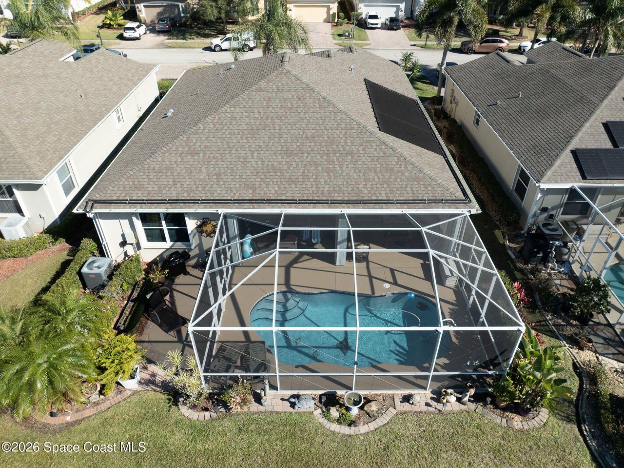 Immaculate and truly turnkey, this pristine pool home reflects exceptional care and pride of ownership throughout. Located in a gated community with HOA-maintained lawn and landscaping, the home features a newer roof and A/C, an upgraded kitchen with granite countertops, black stainless steel appliances, two pantries, and a center island, plus updated bathrooms with granite countertops. Enjoy a screened-in pool with water and amazing sunset views, a spacious entertaining patio, and a hot tub that conveys. The flexible layout includes three bedrooms plus an office or flex space. The primary suite offers dual closets and vanities, a water closet, and a large walk-in shower. Convenient access to Bayside Lakes Community Center. Extras included: hot tub, second refrigerator, washer, dryer, and crystal chandelier. Meticulously maintained and truly move-in ready with furnishings negotiable!