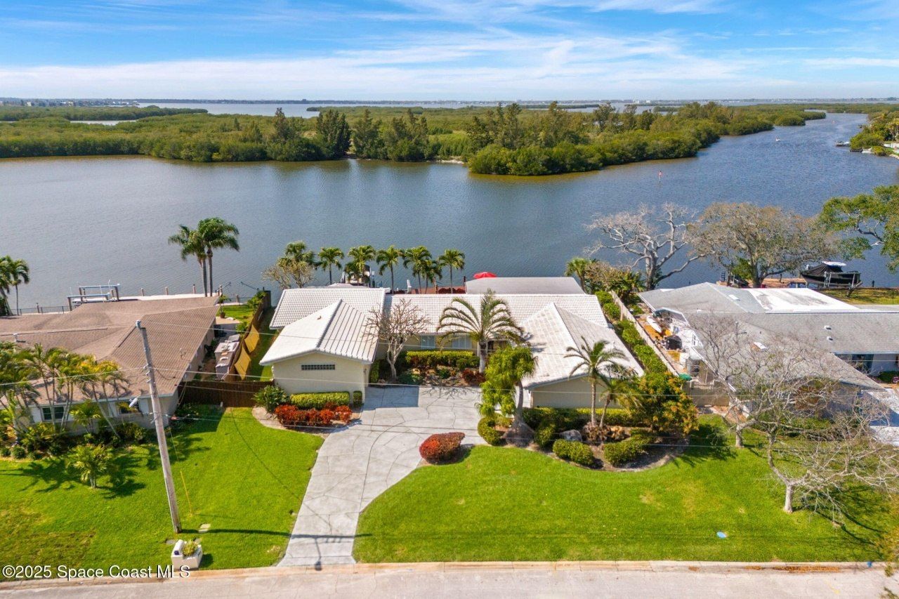 PRICE IMPROVEMENT! Welcome to waterfront luxury in this stunning one-story, 4 bedroom, 3.5 bath Cocoa Beach pool home, offering breath-taking views of the Banana River and Thousand Islands. Enter through the stainless steel front door and be amazed with the immense open room featuring a window-wall overlooking the River and large dock with 2 boat lifts. Inside you will find 2 comfortable seating areas, a dining area, and a large well-planned chefs kitchen providing generous counters, 2 sinks, sleek cabinetry & SS appliances, including a gas range. A hallway leads you to the addition, completed in 2012, where you will find a giant primary bedroom featuring a window-wall with River views and covered back patio. Inside high ceilings, seating area and a kitchenette, complete with counter space, sink, cabinetry and refrigerator. Adjoining is a full-room closet, complete with laundry area, washer & dryer, plus a primary bath with soaking tub and separate shower with full-body jets.
