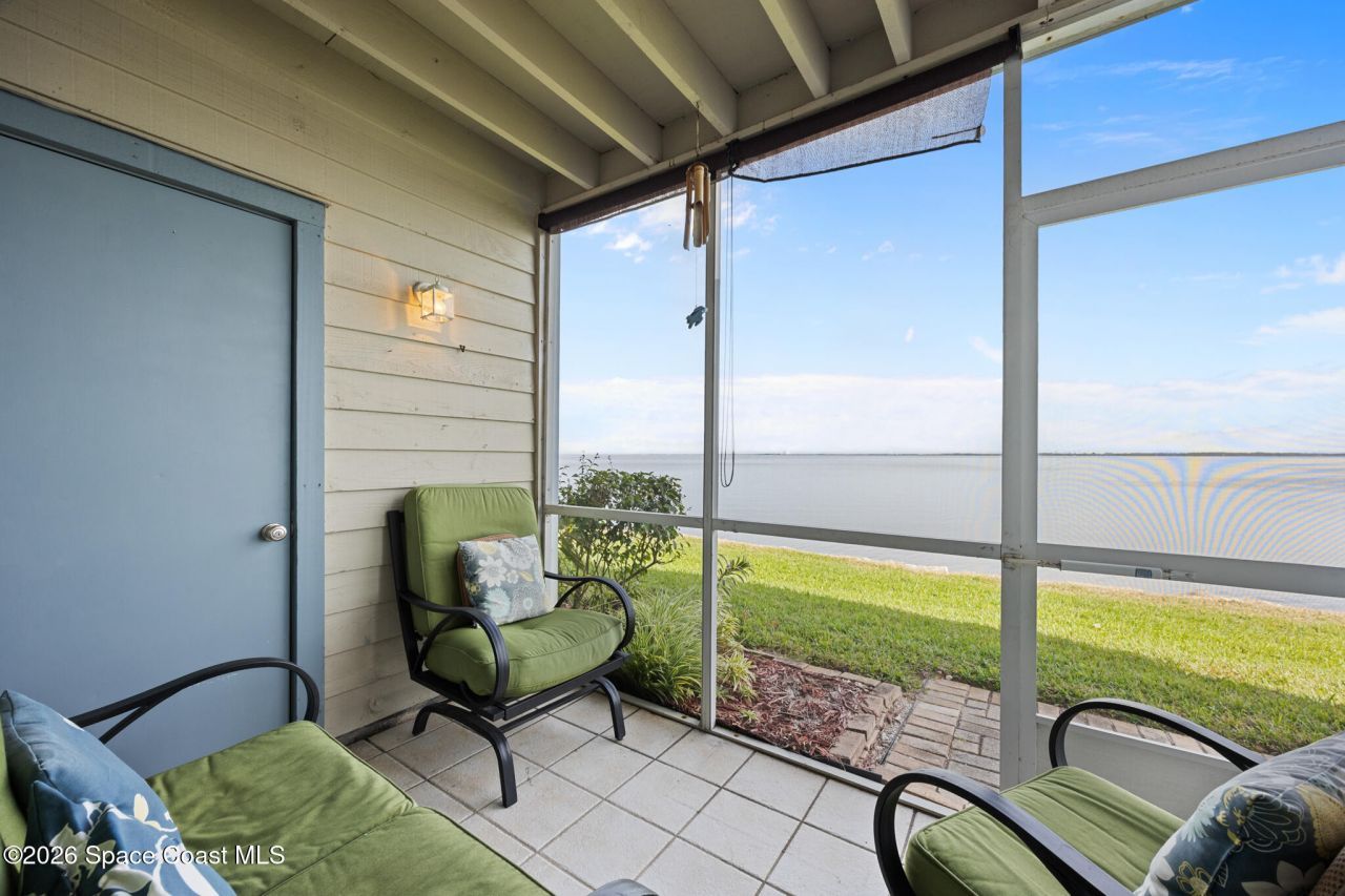 Nestled along the tranquil shores of the Indian River Lagoon, this beautifully updated first-floor end-unit condo offers captivating water views and a true coastal lifestyle. Wake up to shimmering sunrises, sip your coffee and watch dolphins and manatees glide by, and enjoy front-row views of iconic rocket launches?all from the comfort of your screened in waterfront patio.This spacious residence features 2 bedrooms plus a versatile flex room, ideal for a guest suite, home office, or fitness space, along with 2 full bathrooms and 1,186 square feet of thoughtfully designed living space. Ground-floor living with no stairs provides ease and convenience.The coastal-inspired kitchen showcases quartz countertops, white shaker cabinetry with gray accents, stainless steel appliances, a stylish backsplash, and a soft-touch faucet?perfect for both everyday living and entertaining. Bamboo laminate flooring flows through the main living areas, while plush new carpeting enhances the bedrooms Recent updates include impact windows and sliding glass doors, a new AC, updated bathrooms, newer roof, and a brand-new GE refrigeratoroffering peace of mind and modern comfort.Step onto your screened-in porch and soak in the calming water views. This desirable waterfront community features a fishing dock, resort-style pool and hot tub, and BBQ area, creating the perfect setting for relaxed coastal living.Just minutes from Kennedy Space Center, Beaches, Cruise Terminals, major space industry employers.****** Quarterly HOA dues being reduced to $1950 effective 4/1/2026**********