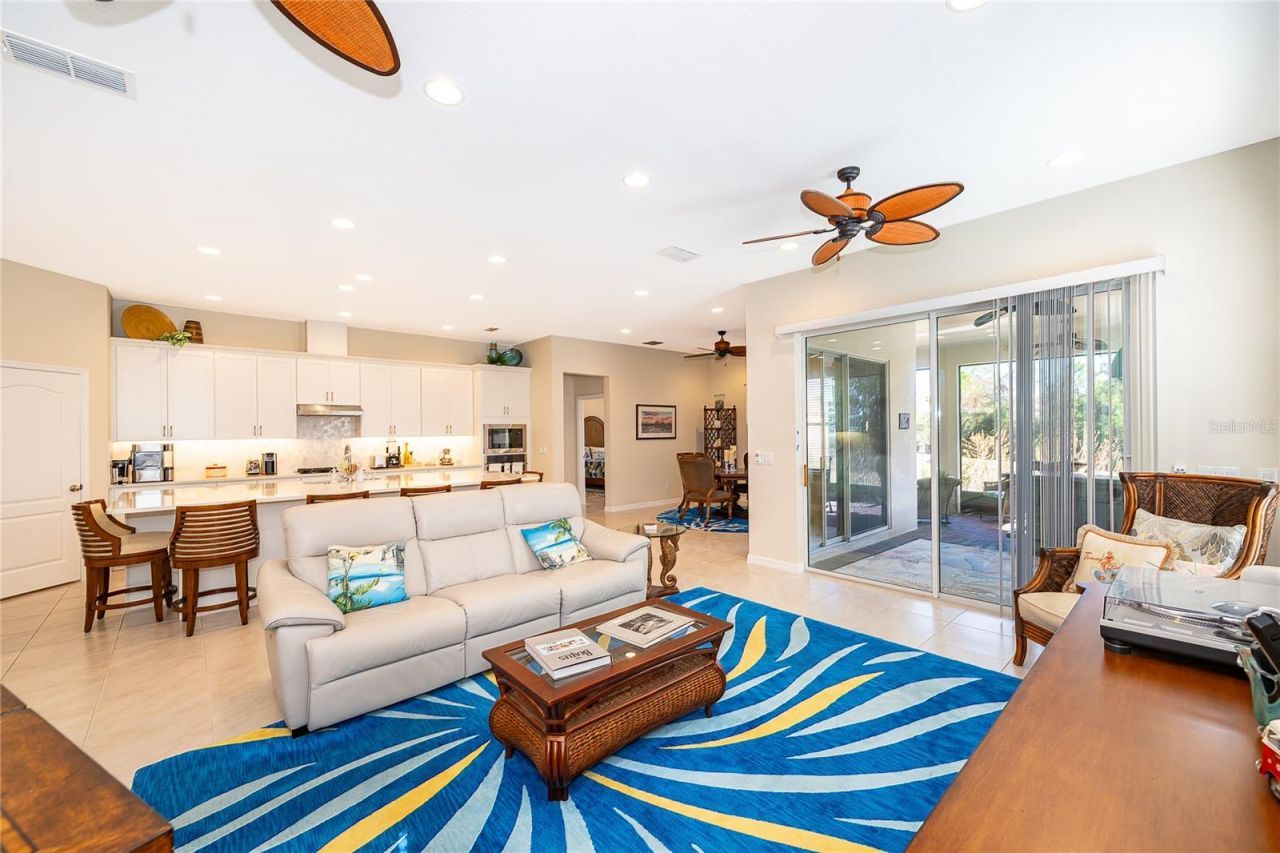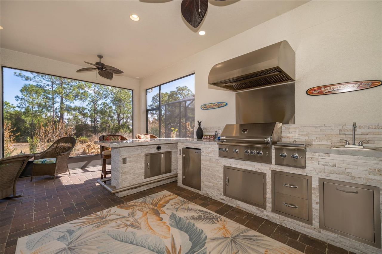 Welcome to refined Florida living in the sought after Four Seasons Orlando 55 plus community. This beautifully upgraded single family home offers 2,360 square feet of thoughtfully designed space, combining comfort, function, and lifestyle in one of Central Florida's most desirable active adult neighborhoods.The sought-after Dominica model showcases a thoughtfully designed floor plan features 2 spacious bedrooms, 2.5 baths, and a dedicated office with a closet that can easily function as a 3rd bedroom. A private guest suite with its own full bath creates an ideal setup for visitors, while the expanded primary suite delivers a true retreat with a bump out design, 2 walk in closets with custom built ins, and a fully upgraded primary bath. The bath showcases dual sinks, granite countertops and a large walk in shower with a repositioned rain head for a spa like experience.The kitchen is both stylish and functional, equipped with GE Profile appliances, enhanced lighting, added outlets, and a reworked pantry featuring custom shelving for exceptional storage. The laundry room has been fully built out with cabinetry and additional storage, and fans have been added throughout the home for comfort and energy efficiency.The dedicated office is a standout feature, offering wall to wall built ins and a large desk, perfect for working from home or managing hobbies. The garage has also been enhanced with added shelving and a separate storage area.Outdoor living is where this home truly shines. Seamless corner glass sliders open to your private outdoor oasis. Enjoy a large covered patio with ceiling fans and a fully equipped summer kitchen featuring a gas grill, 2 burners, refrigerator, sink, and generous storage. The outdoor kitchen alone represents an estimated $17,000 investment. The pavers have been sealed and re sanded adding both beauty and longevity.The interior shows extremely well, with systems in good working order. Furniture is negotiable, and TVs can remain with the home. Jimmy Buffett and Disney themed memorabilia and media do not convey.Located close to the clubhouse and community amenities, this home offers a lifestyle focused on leisure, connection, and comfort. Four Seasons Orlando continues to see steady buyer interest that supports both value and opportunity.Residents of Four Seasons at Orlando enjoy an exceptional lifestyle with 24-hour guarded entry, a 13,000-square-foot clubhouse, two resort-style pools, spa, fitness center, tennis, pickleball, and bocce courts. HOA fees include exterior landscaping, allowing for truly maintenance-free living.This home is ideal for a buyer seeking a turnkey lifestyle with meaningful upgrades, strong indoor and outdoor living spaces, and the unique energy of a resort style 55 plus community. All of this just minutes from Walt Disney World and Central Florida's premier dining, shopping, and entertainment destinations.Luxury, leisure, and location, perfectly combined in one extraordinary home. Reach out today to schedule your private showing!
