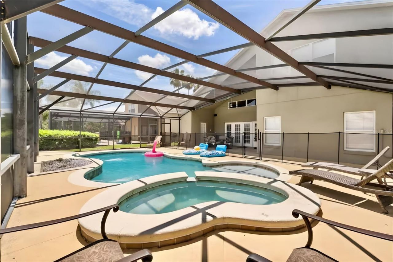 PRICE CONDITION AND LOCATION - This house has it all! Just 1.7 miles from the H2O water park, 1.4 miles from downtown Margaritaville's Sunset Walk, and 4.1 miles from Disney property. This heavily booked short term rental single family home is projected to gross 70k! It is perfect for an investment, new or second home. No leasing restrictions allows homeowners to enjoy their property whenever and however, they would like. Some recent improvements include: NEW ROOF 2021 - POOL RESURFACED 2024 - NEW AC 2023, Newly redecorated, Fully converted garage under AC being used as a huge Media Room. The property as a Gas range and pool heater! Enjoy the open floorpan with soaring ceilings to the second floor. This sought after floorpan features 2 MAIN BEDROOMS on main floor each with private ensuite. Upstairs you will find 4 more bedrooms - 2 Bedrooms with private ensuite AND 2 bedrooms connected by a Jack-and-Jill bathroom. All bedrooms are a generous size with Kings beds or 2 twin beds. Be transported to another time and embrace the feel of Luxury vintage travel through the beautiful themed decor. The classic movie theater is always a crowd pleaser. Don't forget the billiard room, outdoor half bath and full guest bathroom on 1st floor. Step outside and enjoy the Florida weather on your oversized screened patio with covered seating area. Enjoy the large POOL and SPA complete with sun-shelf and water features. If that wasn't enough this intimate and private community offers low HOA dues that cover the gate and lawn service, ensuring a well-kept neighborhood. This community is truly a hidden gem with a mix of full-time residents and vacation rentals. No limitations on property management companies, so you have the flexibility to make this home truly yours! Don't miss out on this incredible opportunity to own a piece of the magic near Disney.